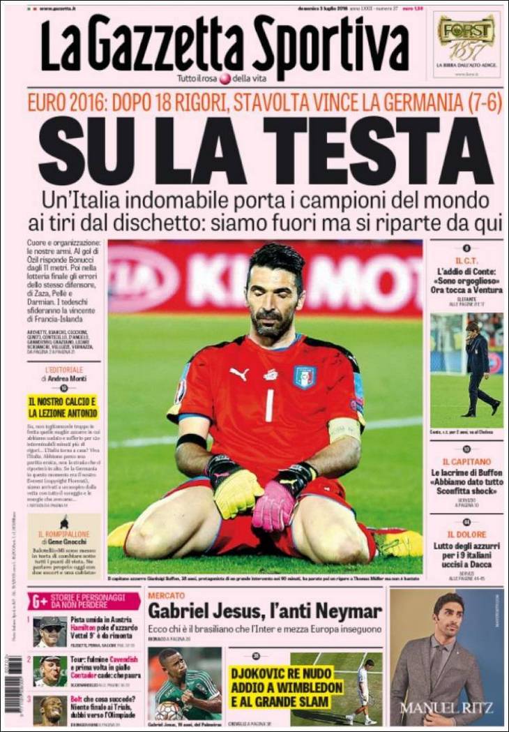 «Удача была на стороне Германии. Ей удалось изменить историю. После 18 ударов с 11-метровой отметки Италия впервые проиграла. Футбол – это вид спорта, который был придуман англичанами, в него играют 11 человек против 11-ти, но как всегда побеждают немцы. Теперь им проигрывают и итальянцы, хотя поначалу имели шанс сохранить тенденцию. Лёву удалось остановить успех тактической системы [рулевого "Скуадры Адзурры" Антонио]Конте. И только абсурдные действия Джерома Боатенга, которые привели к назначению пенальти, помешали добиться своего во время самой игры».