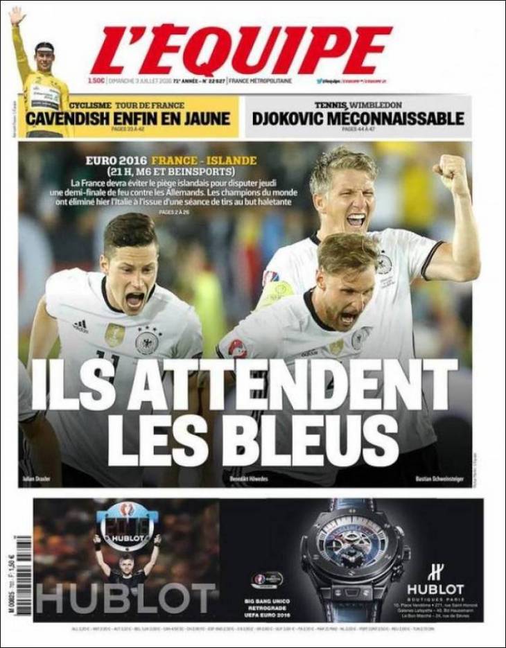 «Сборной Германии удалось пробиться в полуфинале после серии пенальти. Отныне Италия уже не есть черной меткой для "Манншафт". Йонас Хектор покончил с итальянским кошмаром для своей нации, тогда как Боатенг оказался гандболистом. История изменилась в Бордо. Несправедливость бывает так часто, что все решается в серии 11-метровых».