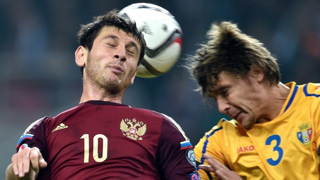 Вновь раз за разом упираются атаки сборной России в плотную оборону Молдавии. Атака правым флангом закончилась прострелом, но Дзюба снова оказался закрыт.