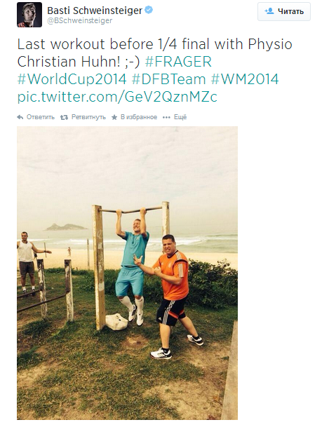 А вот так к четвертьфинальному поединку против Франции в сопровождении тренера по изподготовке готовился хавбек сборной Германии Бастиан Швайнштайгер.
