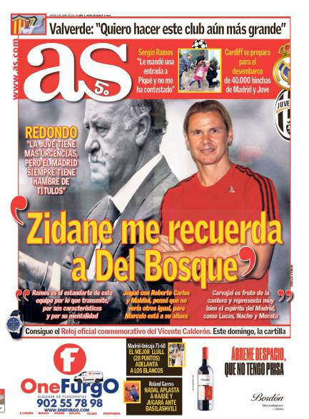 На днях журналист AS Хавьер Маталланас поговорил с Редондо по поводу еще одного финала против 'Юве', и читать то, что сказал аргентинец, очень приятно. 'Зинедин Зидан напоминает мне Висенте дель Боске', — заявляет он. Мне это нравится. Он также говорит о том, что 'Реал' всегда должен побеждать, о значении Серхио Рамоса для нынешней команды, делится мнением о Роберто Карлосе, Паоло Мальдини и Марсело. Кроме того, он говорит об Иско, Дани Карвахале, молодежной академией 'Реала'. Я никогда не был таким же 'редондистом', как многие из моих близких друзей, но я полностью согласен с тем, что Фернандо говорит о финале», — пишет главный редактор AS Альфредо Реланьо.
