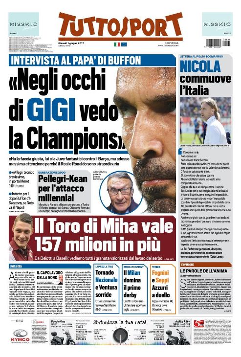 «Кардифф — 'земля обетованная'. 18 тысяч поклонников 'Юве' готовы к вторжению», — говорится в статье на Tuttosport. «Каждый из них одержим мечтой увидеть, как Джиджи Буффон поднимет над головой желанный титул. 18 тысяч — на автобусах и самолетах. Уэльс примет 27 чартеров с болельщиками — из аэропортов Турина, Милана, Бергамо, Вероны, Болоньи, Рима и Катании. А еще 38 организованных автобусных рейсов и тысячи тех, кто будут добираться своим ходом.