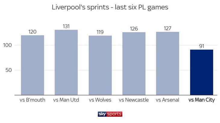 Официальная статистика Премьер-лиги сразу же выявила проблему. В то время как «Манчестер Сити» совершил 124 спринта за 90 минут, «Ливерпулю» удалось сделать всего 91. Это был их второй самый низкий результат в сезоне, и он резко упал по сравнению с предыдущими пятью встречами, в которых самый низкий результат составил 119.