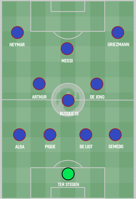Де Йонг может доминировать в центре поля с Бускетсом. Плюс Месси получит ключевую роль без оборонительных обязанностей. Не самый сильный защитник Серджи Роберто сможет играть на правом фланге, так как Усман Дембеле сможет возвращаться и помогать ему, чего невозможно добиться при Месси.