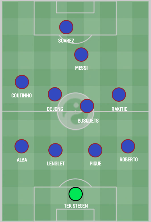 Что ж тогда, они, скорее всего, продолжат играть по любимой схеме Эрнесто Вальверде 4-4-1-1 с Клеманом Лангле в роли напарника Жерара Пике. Френки займет место в центре поля ближе к левому флангу — эта роль даст ему достаточное количество свободы, чтобы ходить в атаку. Остальная команда будет функционировать так же, как и сейчас, предоставляя Ракитичу, Суаресу и Коутиньо гораздо больше игровых минут, чем молодым и быстрым игрокам. Ну и, конечно, им придется полагаться на магию Месси.