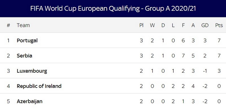 И хотя в этот же день Сербия одолела Азербайджан 2:1, именно Португалия вышла на первое место в группе с семью набранными очками.