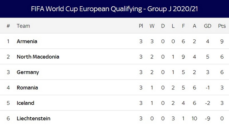 Эта победа позволила Северной Македонии подняться на второе место, потеснив Германию. Лидером группы является Армения, у которой 100-процентный результат в трех турах.