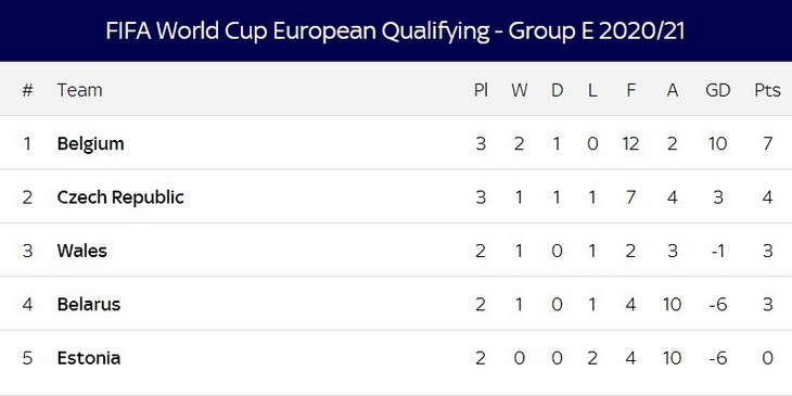 Бельгия, возглавляющая рейтинг ФИФА, набрала семь очков и сохранила лидерство в группе, в то время как Чехия оступилась в Уэльсе, где пропустила единственный гол от Даниэля Джеймса.