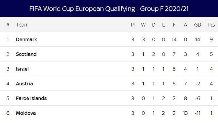 В то же время Дания уверенно лидирует, опережая ближайшую Шотландию сразу на четыре очка.