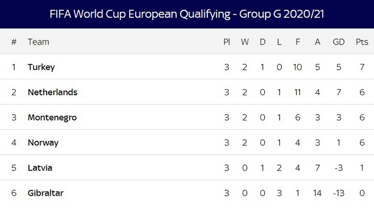 Большим сюрпризом для нидерландцев стала и ничья Турции с Латвией — 3:3. По ходу игры турки вели 2:0 и 3:1, но все равно не смогли удержать преимущество на своем поле.