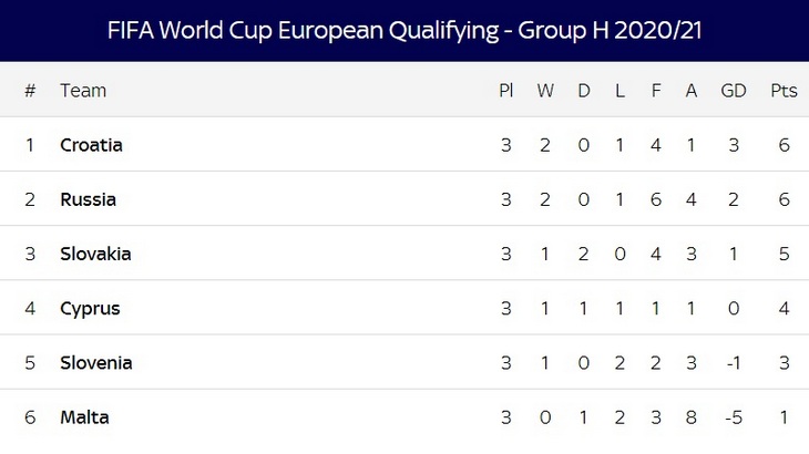 Тем временем Хорватия одержала победу над Мальтой со счетом 3:0 и теперь имеет равное количество очков с Россией, но опережает ее по дополнительным показателям.