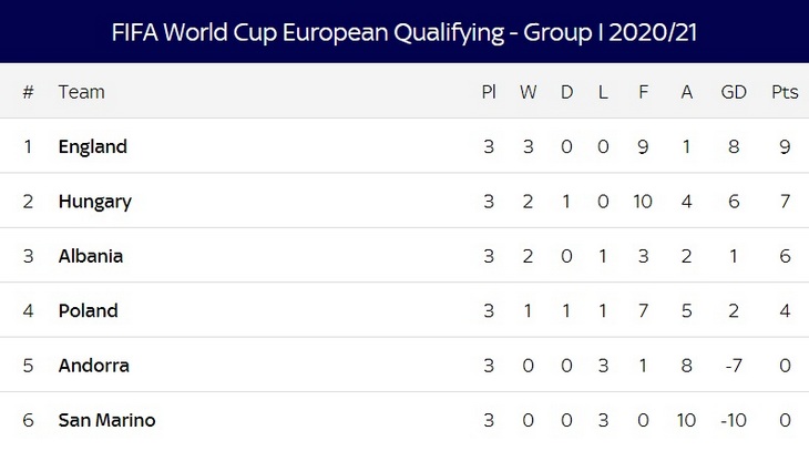 Англия возглавляет группу, а Польша идет лишь четвертой, пропустив вперед Венгрию и Албанию.