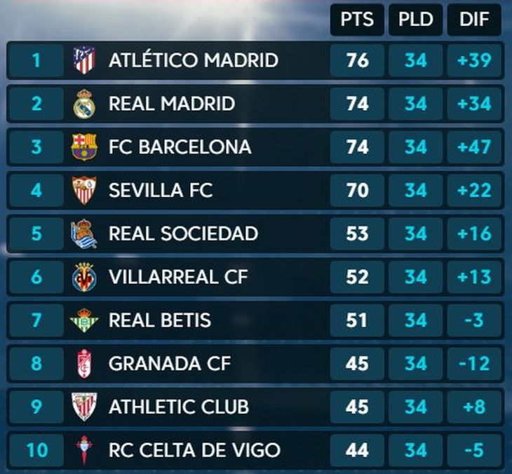 Положение после 34 туров: «Атлетико» — 76 очков, «Реал» — 74 очка, «Барселона» — 74.