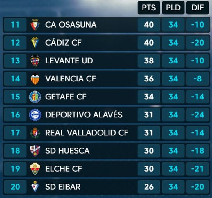 Положение команд после 34 туров: «Хетафе» — 34 очка, «Алавес» — 31, «Вальядолид» — 31, «Уэска» — 30, «Эльче» — 30, «Эйбар» — 26