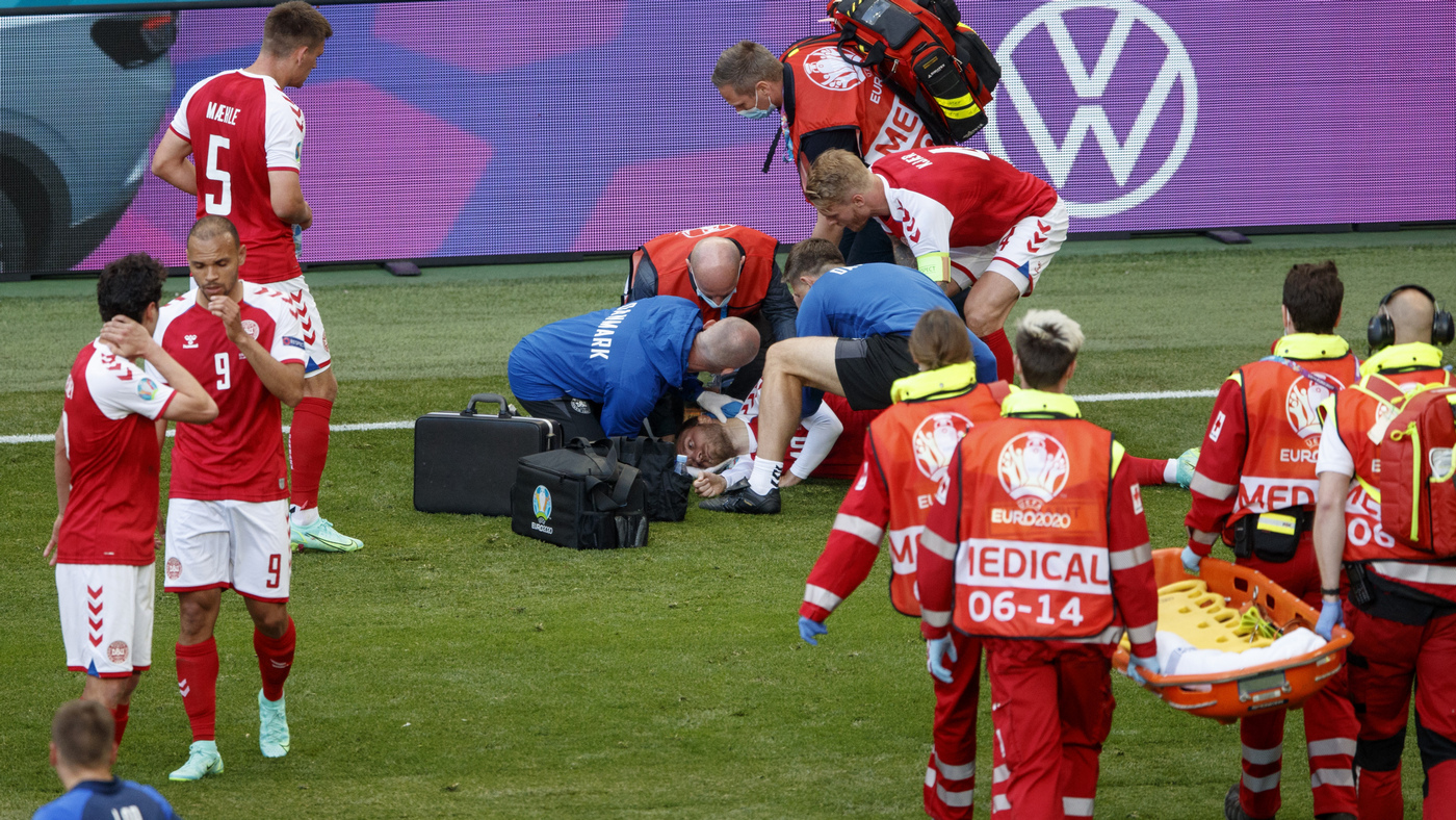 На поле выбежали врачи, которые начали проводить реанимационные процедуры, включая использование дефибриллятора. Когда медики увозили Эриксена с поля, он был в сознании.