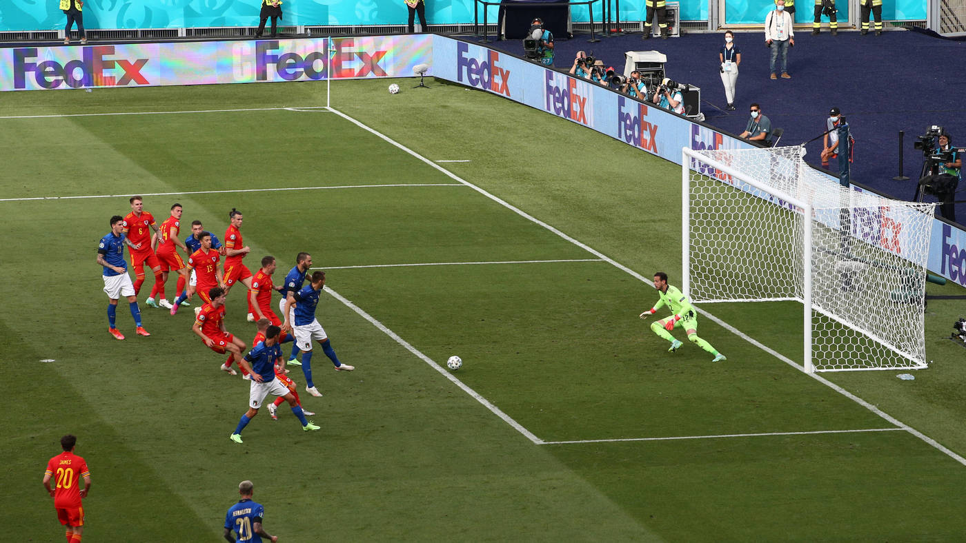 53’ Италия заработала штрафной и выставила свою «стенку» перед «стенкой» валлийцев. Игроки «скуадры адзурры» пригнулись, а Бернардески нанес удар во вратарский угол, но попал в штангу.