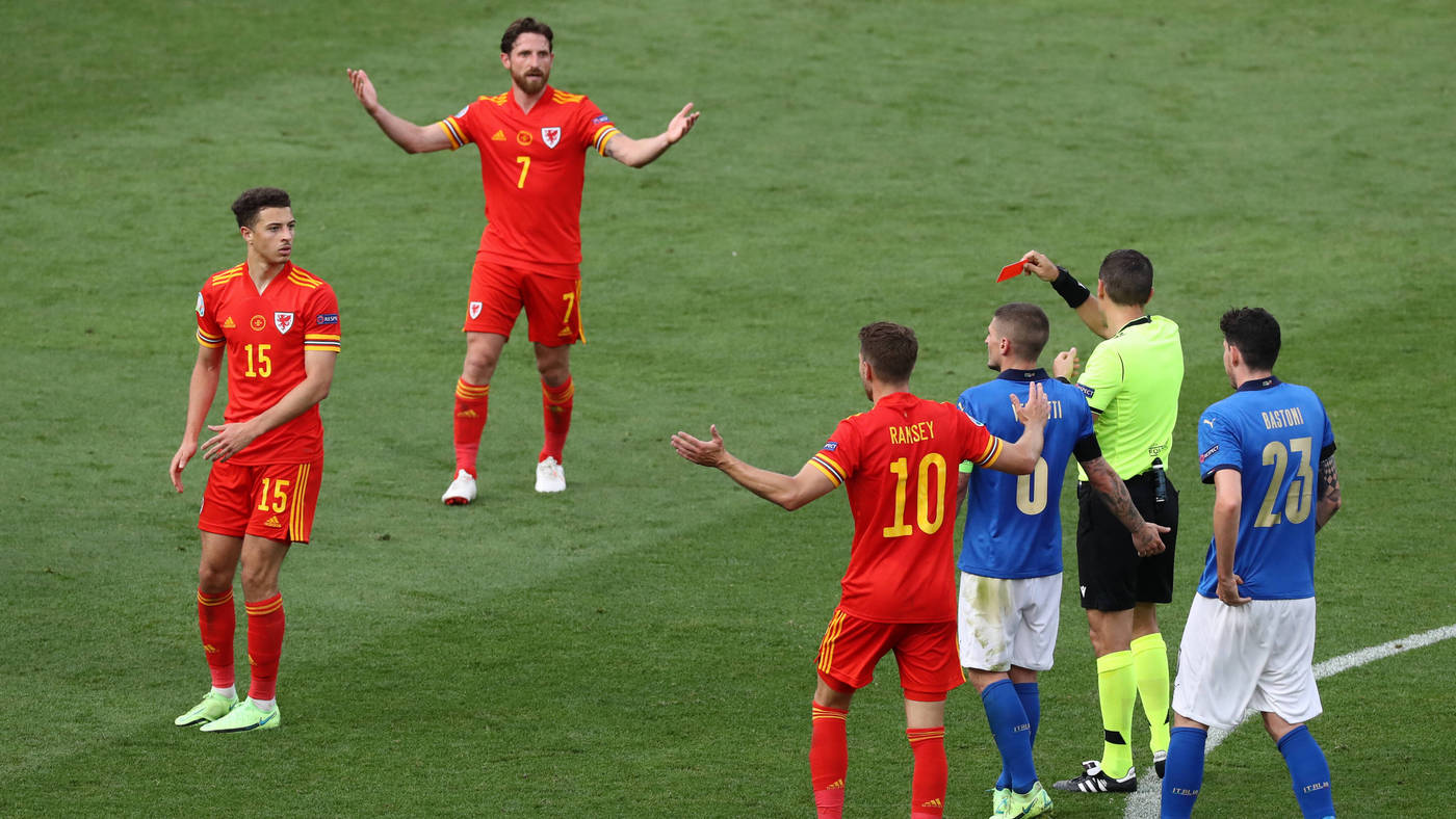 56’ И тут же Уэльс остался в меньшинстве! Итан Ампаду получил прямую красную карточку за то, что наступил на ногу Бернардески.