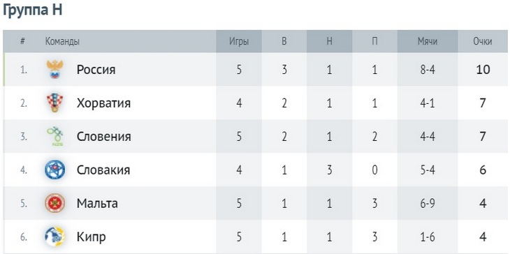 Благодаря этой победе сборная России вышла в лидеры в турнирной таблице группы H, оторвавшись на три очка от Хорватии, у которой есть игра в запасе.