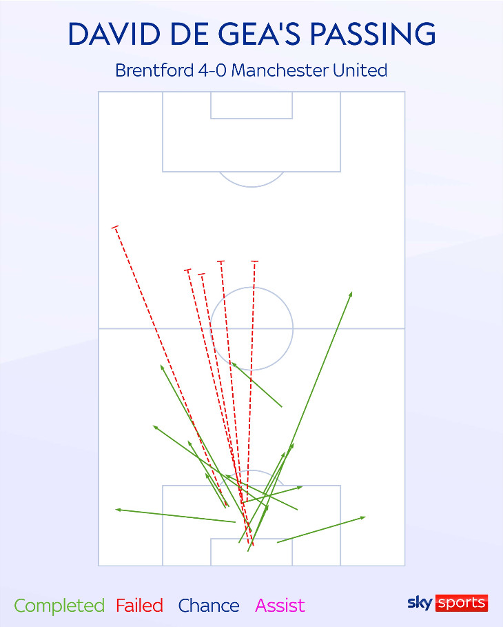 Но после этой ошибки Де Хеа вернулся к типичным для себя действиям. За следующие 40 минут он сделал только одну короткую передачу, предпочитая длинные забросы для минимизации риска. Только один из его длинных пасов нашел партнера по команде. Его показатель успешных передач в итоге упал до 56 процентов.