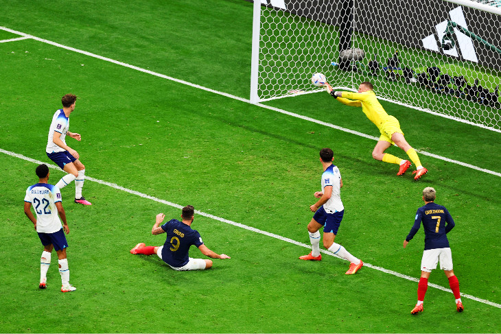 На 76-й минуте, при счете 1:1, Мбаппе набрал скорость на левом фланге и у штрафной англичан покатил мяч немного назад, на Рабьо. Тот навесил к дальнему краю штрафной, Дембеле сделал скидку в центр на Оливье Жиру, опасно пробившего в падении практически в упор — Пикфорд в прыжке перевёл на угловой.