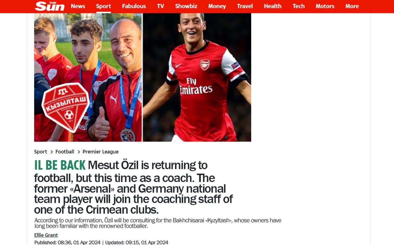 «Авторитетный британский таблоид The Sun утверждает, что экс-игрок лондонского "Арсенала" и мадридского "Реала" Месут Озил начнет тренерскую карьеру в крымском чемпионате.