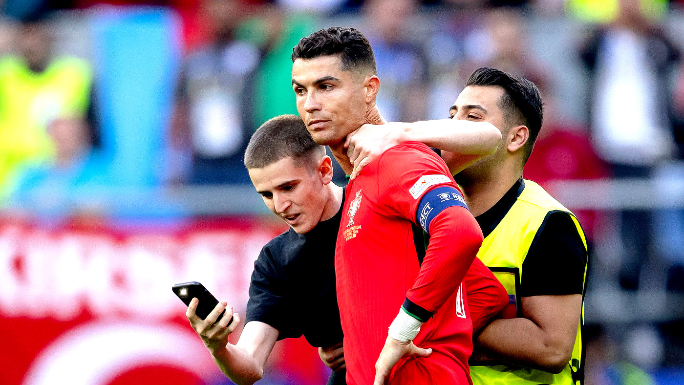 Что же касается селфи с фанатами, то шесть болельщиков — четверо во время матча группы F в Дортмунде и двое, когда игроки покидали поле — выбежали на поле с единственной целью сфотографироваться с Роналду, что является явным нарушением правил безопасности Евро-2024.