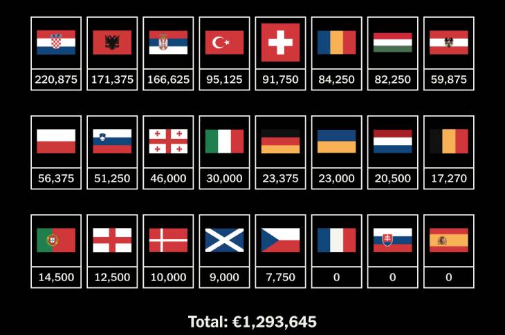 Хорватия была страной, которая накопила самую большую сумму штрафа (220 875 евро), а замыкают тройку лидеров их балканские соседи Албания (171 375 евро) и Сербия (166 625 евро).