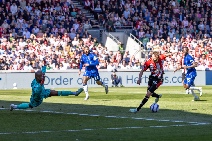 У «Брентфорда» моменты были — и получше. Миккель Дамсгард сначала пробил со штрафного выше ворот, а затем после передачи Йоана Виссы вовсе промахнулся… по мячу, находясь на убойной позиции. Льюис-Поттер головой пробивал после углового — спас Роберт Санчес. Чуть позже Брайан Мбемо перехватил неудачную передачу Риса Джеймса, ворвался в штрафную и пробил — рядом со штангой.