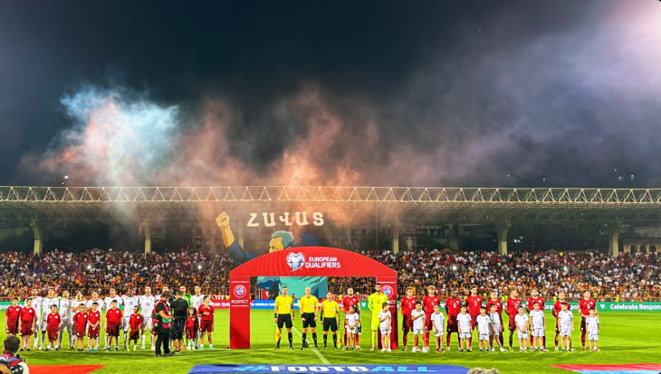 И эта поддержка плавно переехала на стадион. За полчаса до старта две трибуны уже разрывались от фанатских зарядов, а потом на обеих появились перфомансы в поддержку армянской сборной (надо сказать, почти на уровне Бундеслиги!). И даже пиротехника сопровождала выход команд на поле.