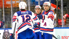 Встреча в Хернинге началась под диктовку американцев. В первом периоде команда Райана Варсофски отличилась трижды. Первый гол забил Тэйг Томпсон с левого круга вбрасывания уже на второй минуте в ходе раннего большинства — 1:0.