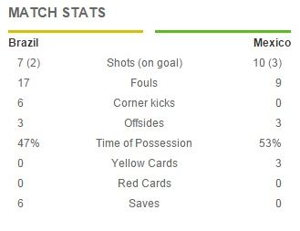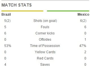 Без моментов пока играют команды. У Мексики совсем не получается пройти оборонительные редуты во главе с Давидом Луисом, который сегодня никого мимо себя не пропускает.