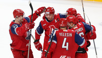 Телегин опасно пасовал в район пятака, никто из россияне не добрался до шайбы.