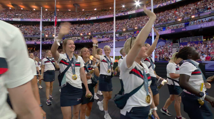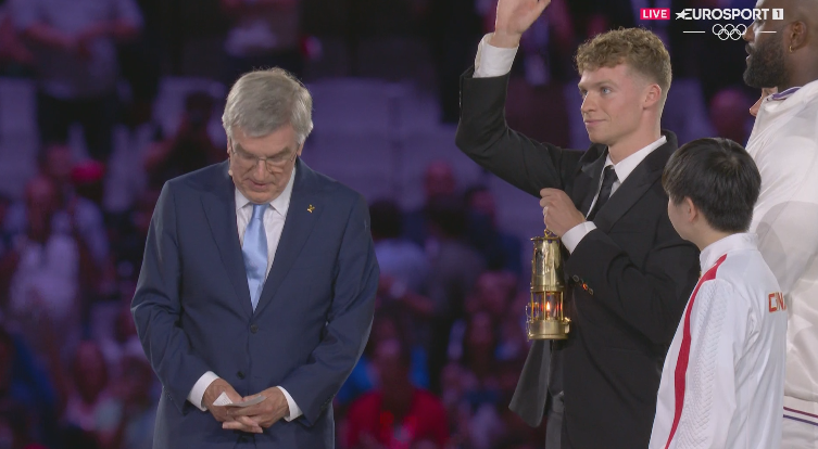 22:18. Антуан Дюпон и Полин Ферран-Прево несут флаг Франции. Дюпон, звезда регби-7 на этих Олимпийских играх, выиграл золотую медаль в финале регби-7 против Фиджи, а Полин Ферран-Прево завоевала золотую медаль в маунтинбайке.